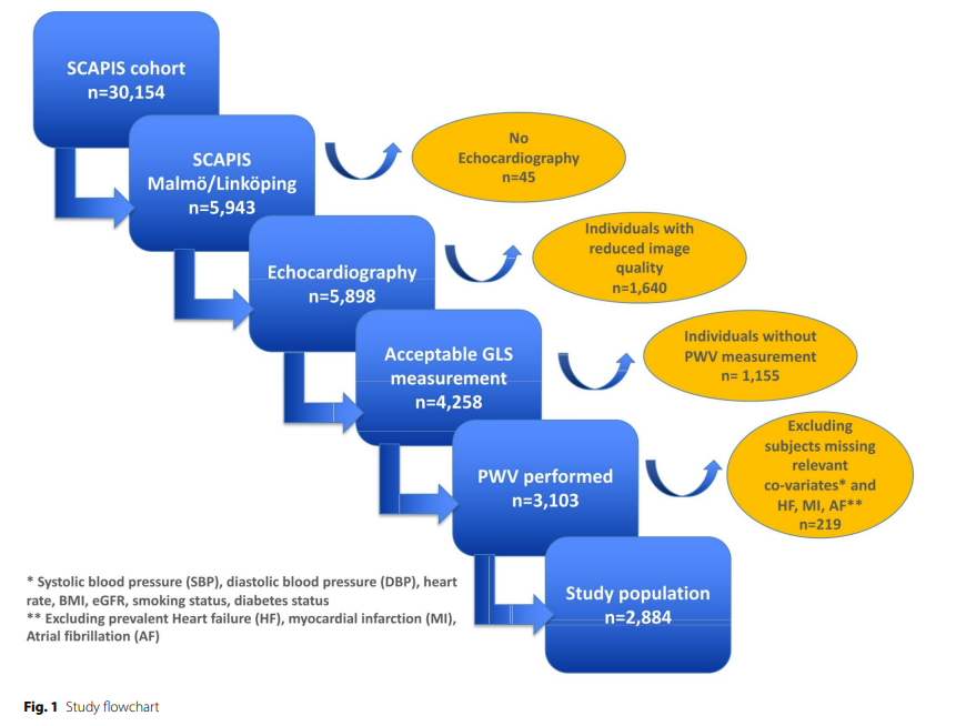 在2013年至2018年期间,瑞典心肺生物影像研究(SCAPIS)从瑞典的六个城市(哥德堡、林雪平、马尔默/隆德、斯德哥尔摩、于默奥和乌普萨拉)招募了30,154名个体(年龄范围50-65岁,51%为女性)。该筛查项目非常全面,此前已有详细描述。我们纳入了来自马尔默和林雪平站点的子组参与者,这些参与者提供了带有整体纵向应变(GLS)测量的超声心动图数据(n = 4,258)。其中,3,103名受试者还拥有脉搏波速度(PWV)测量数据。排除了图像质量较差、患有房颤或房扑、心力衰竭、心肌梗死或相关协变量缺失的参与者,最终研究人群为2,884人(见图1)。该研究由于默奥大学伦理委员会代表所有研究站点批准(编号2010-228-31 M),所有参与者均签署了书面知情同意书。本研究遵循《赫尔辛基宣言》。