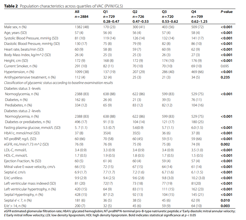 这项回顾性研究纳入了瑞典心肺生物影像研究(SCAPIS)中 2,884 名拥有超声心动图和脉搏波速度(PWV)数据的参与者(平均年龄 57 岁,48% 为男性)。其中,162 人(6%)患有 2 型糖尿病(DM),334 人(12%)处于糖尿病前期。VAC 被量化为脉搏波速度(PWV)与整体纵向应变(GLS)的比值。研究使用线性回归模型评估了血糖状态(糖尿病、糖尿病前期)、糖化血红蛋白(HbA1c)、空腹血糖(fP-glucose)与 VAC 之间的关联,并对相关协变量进行了调整。