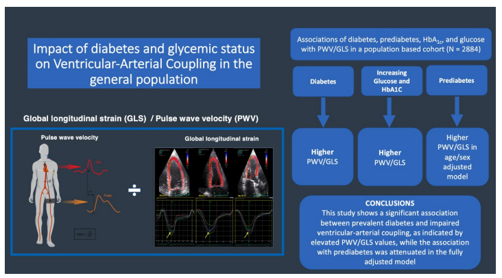 这项回顾性研究旨在探讨糖尿病(DM)和血糖水平对普通人群心室-动脉耦合(VAC)的影响,即使在临床上明显的心血管疾病发作之前。研究使用了瑞典心肺生物影像研究(SCAPIS)的2,884名参与者数据,通过脉搏波速度(PWV)与整体纵向应变(GLS)的比值来量化VAC。