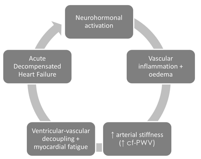 心脏与血管系统的动态相互作用在维持充足的心脏输出量方面起着关键作用。心力衰竭(HF)通常被描述为泵的问题,即机械性心肌衰竭,导致身体各部位的血液供应不良。不过,血管系统的贡献常常被忽视。急性失代偿性心力衰竭(ADHF)预后不佳,且通常伴有并发的慢性肾脏疾病(CKD)和急性肾损伤(AKI),这必然会导致不良后果。心脏与血管系统的相互作用被概念化为心室-血管(动脉)耦合。动脉僵硬度,作为心血管疾病的一种非传统风险因素,可以通过非侵入性方法(如颈动脉-股动脉脉搏波速度(cf-PWV))进行测量。cf-PWV 值过高(模拟动脉僵硬度增加)可能是导致 ADHF AKI 的致病因素。本研究旨在评估在患有心力衰竭(ADHF)和 CKDAKI CKD 中)的患者住院期间,cf-PWV 是否高于稳定代偿性心力衰竭和稳定 CKD 患者。